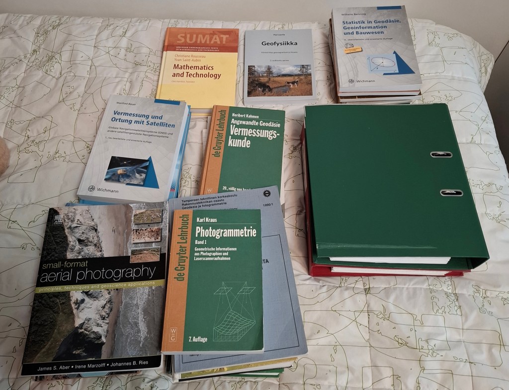 Vähän aikaa sitten lahjoitin Metropolian maanmittaustekniikan koulutukselle ammattikirjallisuutta. Lahjoitettuja kirjoja oli 26 kappaletta, aihealueina muun muassa matematiikka, geodeettinen laskenta, paikannus ja kaukokartoitus. Mukana oli myös kaksi kansiollista geodeettisen laskennan tehtävien ratkaisuja. En aio enää olla aktiivinen näiden aihealueiden asioissa. Geofysiikkaan liittyviä aiheita kuitenkin edelleen seuraan, ja niistä aion myös kirjoittaa.